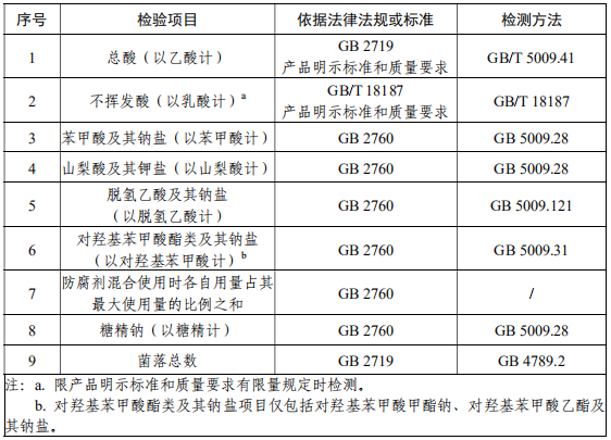 GB 4789.2 食品安全國家標準 食品微生物學檢驗 菌落總數測定 GB 5009.28 食品安全國家標準 食品中苯甲酸、山梨酸和糖精鈉的測定 GB 5009.31 食品安全國家標準 食品中對羥基苯甲酸酯類的測定 GB/T 5009.41 食醋衛生標準的分析方法 GB 5009.121 食品安全國家標準 食品中脫氫乙酸的測定 GB/T 18187 釀造食醋 食醋抽檢項目:
